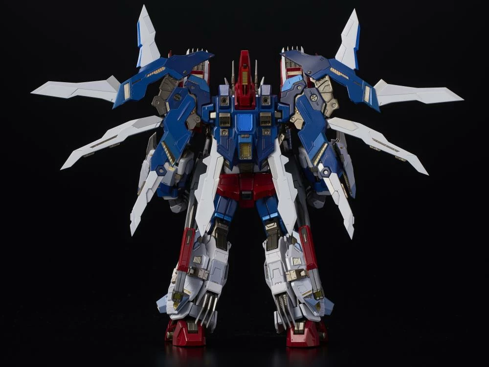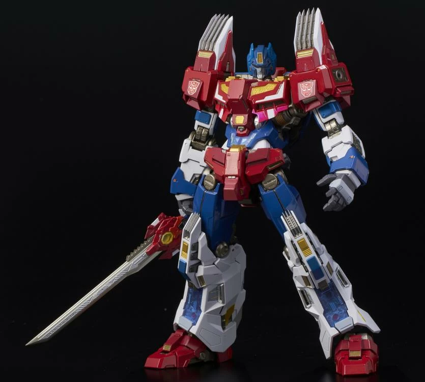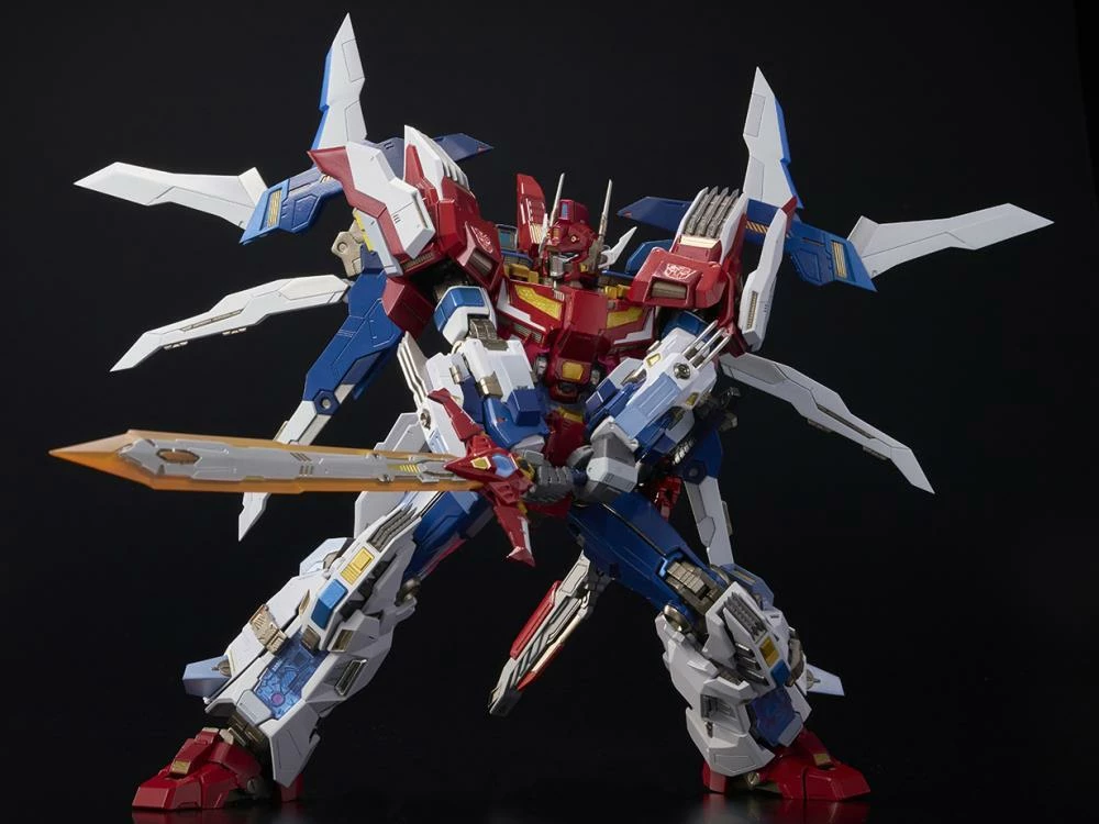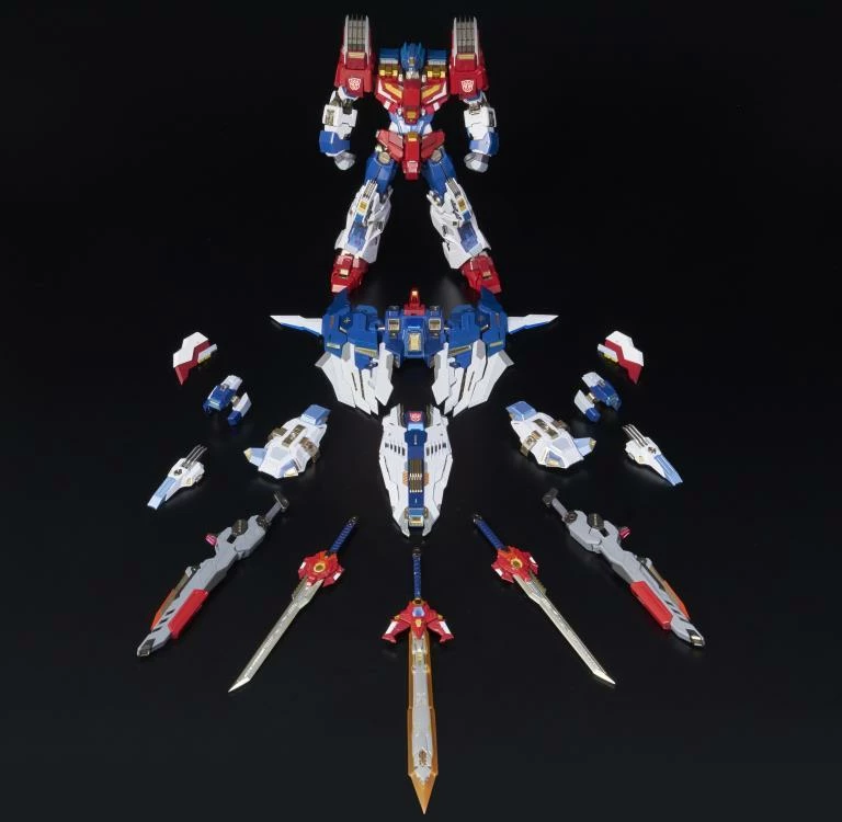From Flame Toys, Star Saber is the fourth figure in the Kuro Kara Kuri line. This non-transforming figure is based the character’s design as seen in the comics. Star Saber features a detachable face mask as well as diecast parts for solidity and heaviness. Weapon accessories include 2 small swords, a big sword, shield, and 2 small busters can be combined to be a big buster!