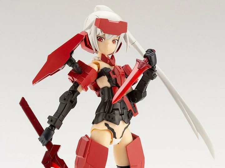 This Frame Arms Girl and weapon set includes a Jinrai model with a Japanese-style red, black, and white color scheme as well as a matching set of weapons in a complementing red color. The kit also includes silver foil decals and special facial expression decals.