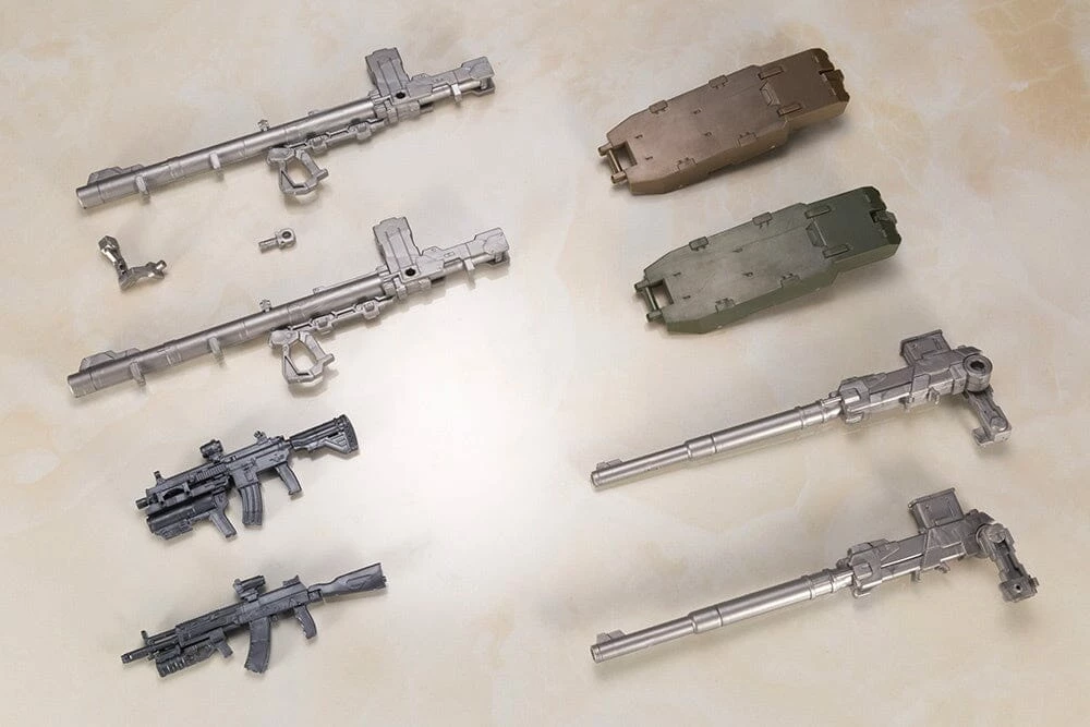 These extra weapons are made to order for your Frame Arms Girls kits, and their 3mm ports also make them compatible with Frame Arms, Hexa Gear and other mecha kits! Includes shoulder armor, two types of assault rifles, a pair of bazookas and two back-mounted cannons.