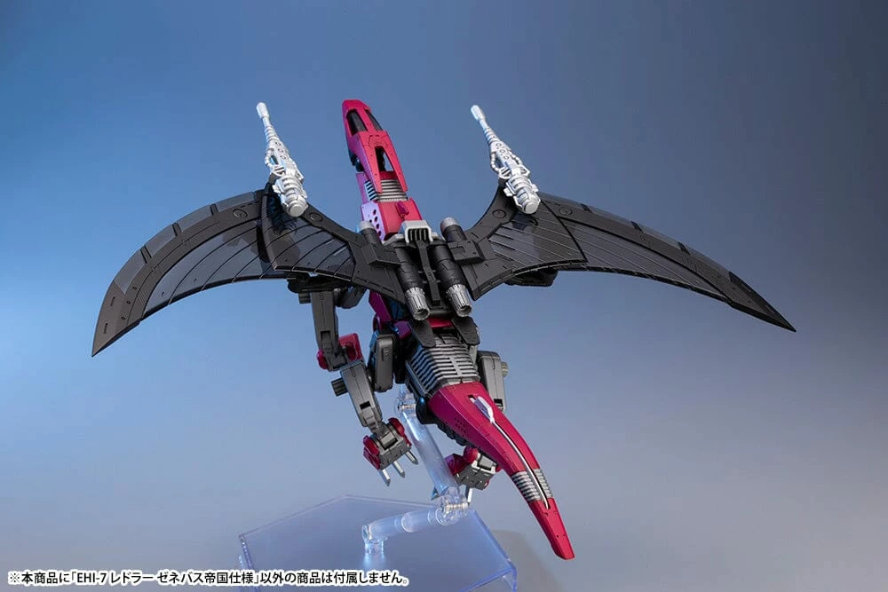 The Empire’s state-of-the-art supersonic biomechanical fighter jet! The dragon-type Zoid Reddra joins the HMM series as the first flying Imperial Zoid. Hidden within the Zoid’s beautiful red silhouette is a wealth of articulated features. The “Retractable Cutting Wings” can be deployed without interfering with the movement of the tail, and the back intake and nozzle can be replaced with joint caps.