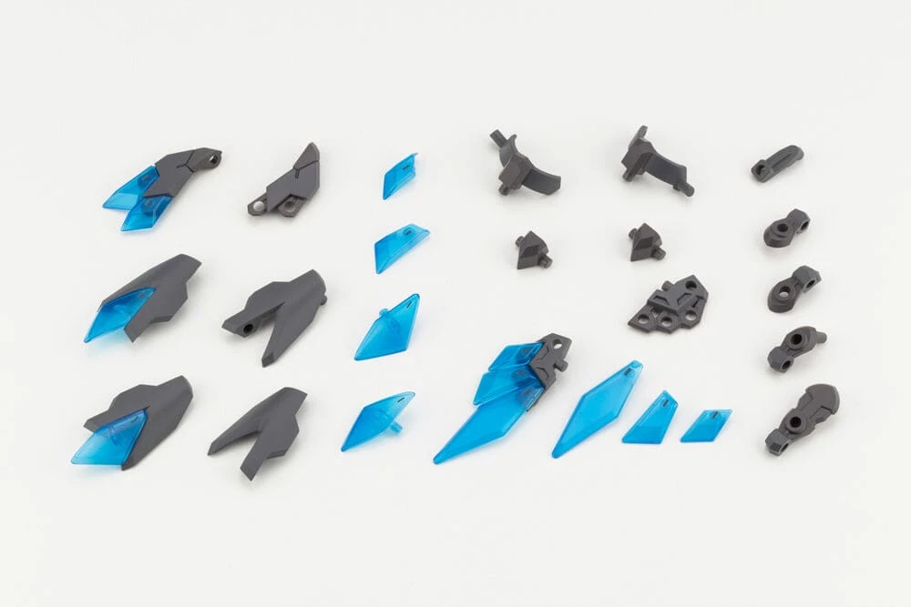 This item fits perfectly with bishoujo-style plastic models such as Frame Arms Girl and Megami Device. By just attaching the armor, the dual-color white and clear blue color sculpt brightens the overall look of any given plastic model. The armor parts use 3mm connections so users can not only just remove each individual armor piece, but can also remove the clearparts and use them separately.