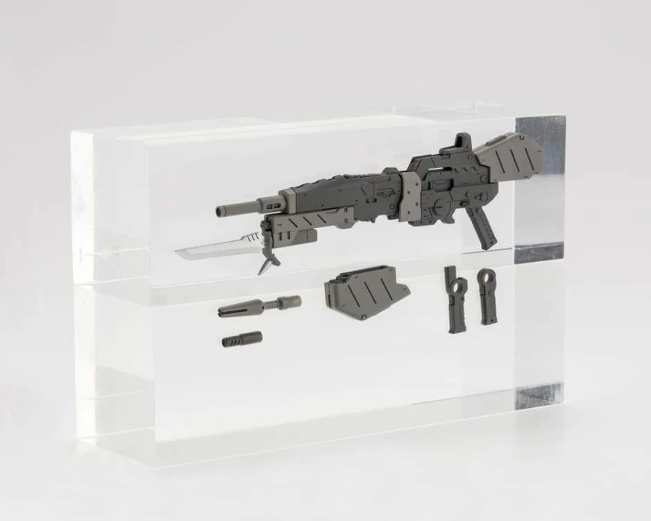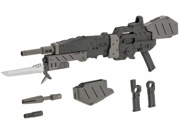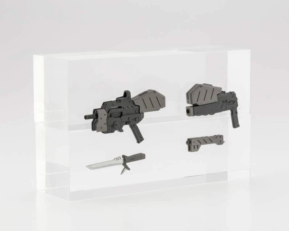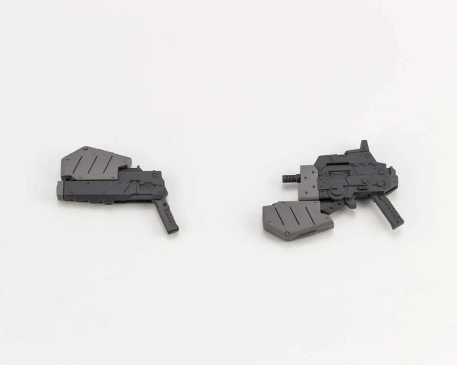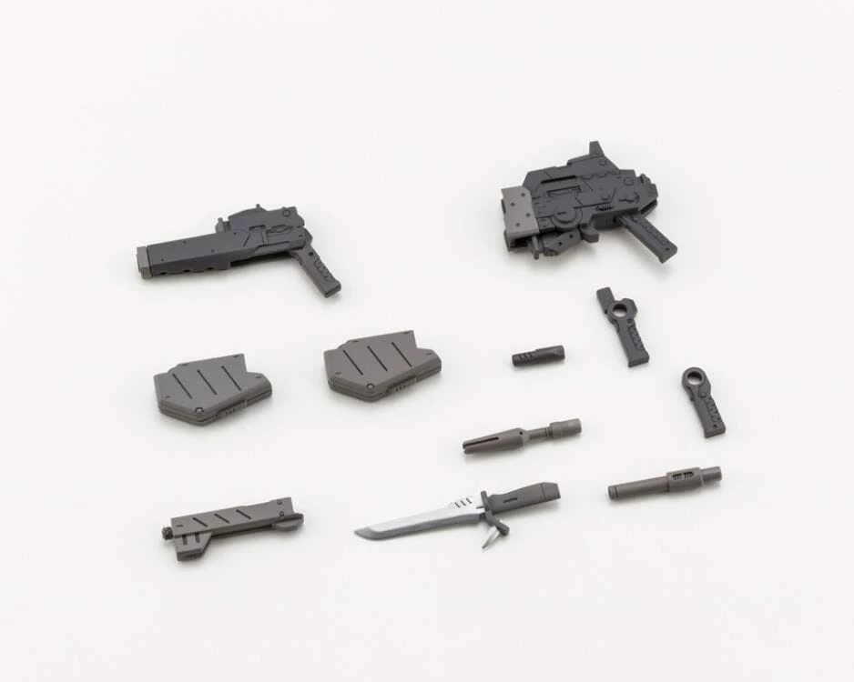 Combine the two types of handguns (Type-A and Type-B) to create the Twin Link Magnum in its basic form. The muzzle comes in two variations to increase customization options. The magazines on both Type-A and Type-B handguns can be removed. Use the rail parts from Type-B to turn the included combat knife into a bayonet. The combat knife can be displayed with other Kotobukiya model kit series such as Frame Arms and Frame Arms Girl. The grip parts are adjustable, allowing the weapons to be held at various angles depending on the model. A short grip is also included for even more customizability. The kit features a light gray and dark gray color scheme, so a model faithful to the completed design can be created just by assembling the model.Â