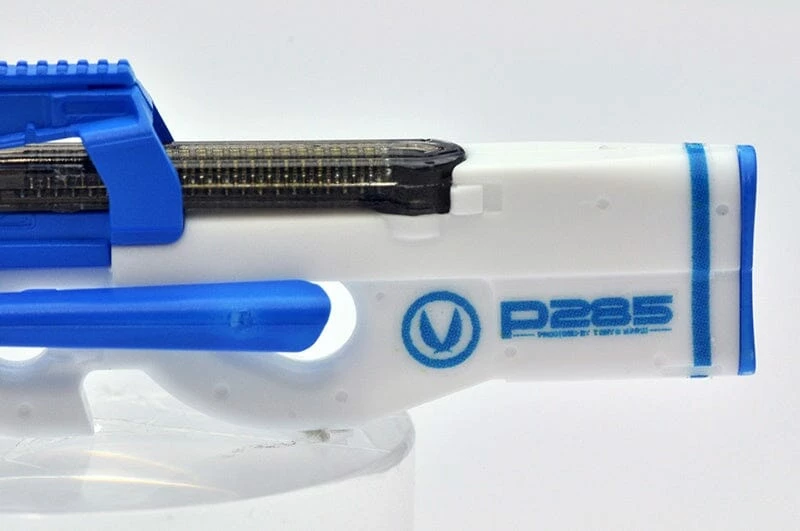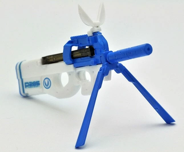 Nipako’s twin tails; the sight has been redesigned to look like her bunny-ears hair ribbon, too! It’s also molded in white and painted partly in blue to echo Nipako’s typical outfit. The logo marks are tampo printed, and the bipod is available in both open and closed versions; the bipod and suppressor parts are removable