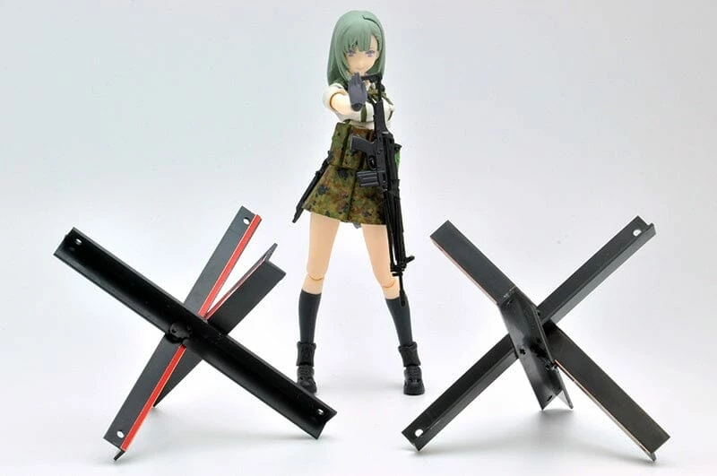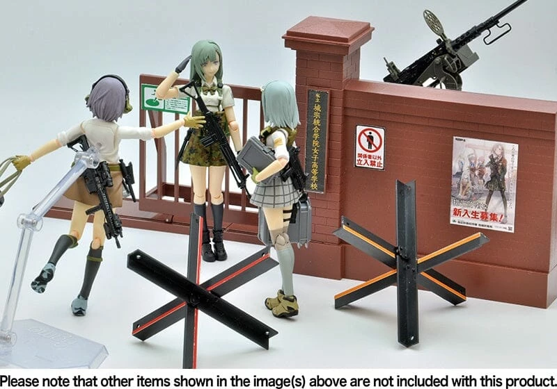 Give your Little Armory figures something to defend with this scene model kit from Tomytec! It includes a sliding rail-type gate (please note that the gate does not actually slide) coupled with a traditional brick wall, such as those found at schools, public facilities, military bases, etc. here in Japan. A newly molded barricade has also been added! The barricade is an anti-tank type popular during World War II, informally known as a “Czech hedgehog.”