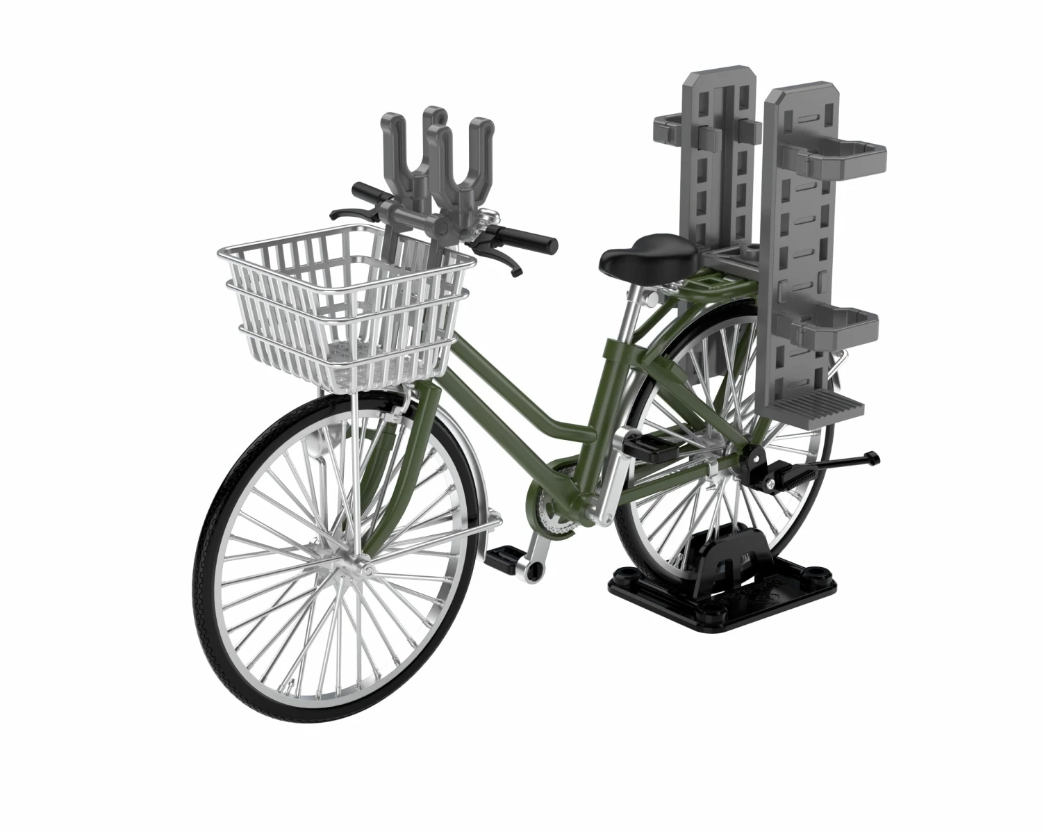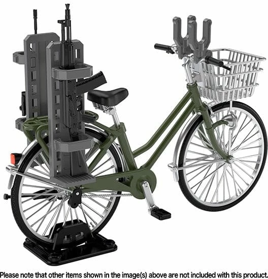 This 1/12 scale bicycle in olive drab is perfect for your Little Armory figures, or any other figures of the 1/12 scale! This bike has a casual air and atmosphere to it, but has compartments to equip secret or not-so-secret weapons…! The pedal and wheels can move and the bicycle can also be placed in steering positions.