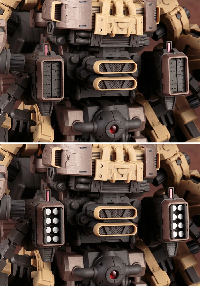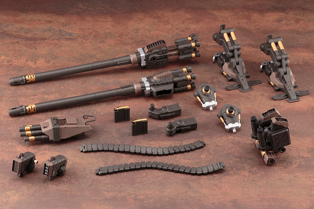 This massive kit is the most voluminous of any Kotobukiya plastic model kit up until now. The Long Range Buster Cannons boasts a length of 360mm and have a pullout expansion feature at the rear. For user customization, attachment parts are included so the Long Range Buster Cannons can be attached to other separately sold Zoids (e.g., Blade Liger, Liger Zero). By pulling the sensor part of the 8-Barreled Missile Pods on the torso, the hatches will open. Also, similar to the IRON KONG PK model, the energy cables contain an internal wire that allows for flexible movement. Enjoy the overwhelming power of Gojulas The Ogre, worthy of being called the strongest Zoid.